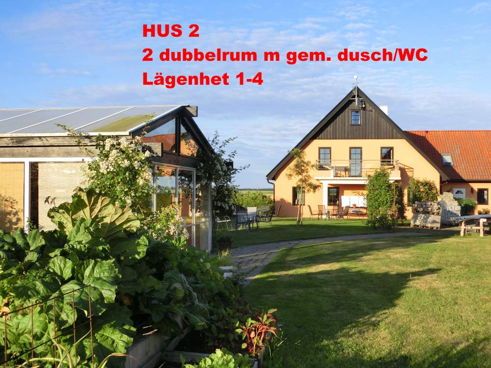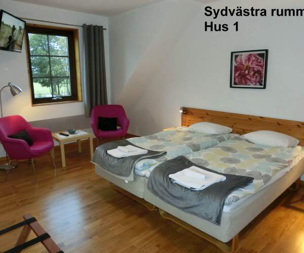 Room in house no. 1 Vi har 4 dubbelrum med egen dusch/WC på varje rum. 2 rum vetter mot söder (19kvm/21kvm) och 2 mot norr (18kvm/18kvm). I anslutning till rummen finns det ett gemensamt pentr…